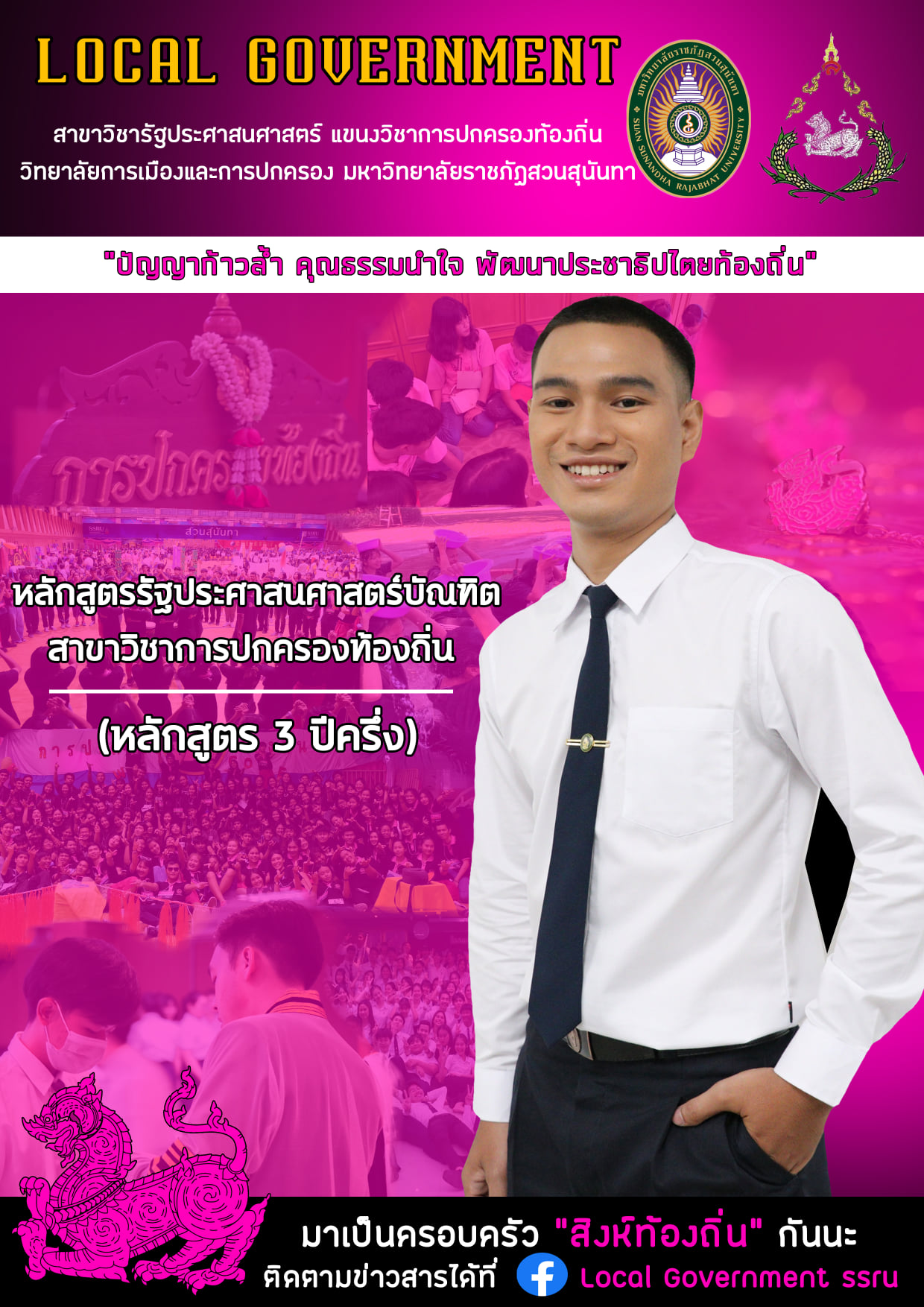 Local Government Administration Bachelor of Public Administration (3-and-a-half years program), Public Administration, College of Politics and Governance Suan Sunandha Rajabhat University "Local Governance, The Foundation of Democracy, The Heart of People's Access" is a curriculum that focuses on encouraging learners to participate constructively. Experience critical thinking As a learner, it is a real center of education. Knowledge can be applied in accordance with the local community context. Expert faculty members are closely supported by academic support.