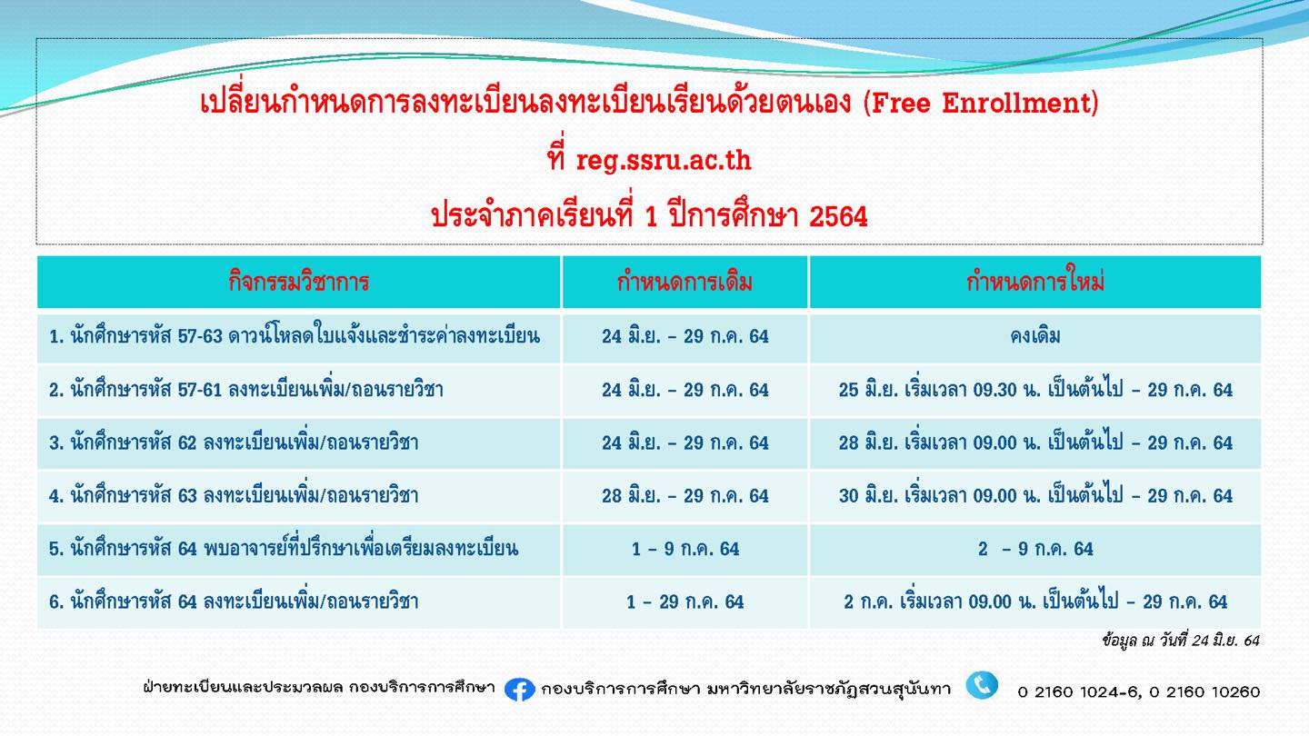 announce Change of free enrollment schedule at reg.ssru.ac.th semester 1, academic year 2021