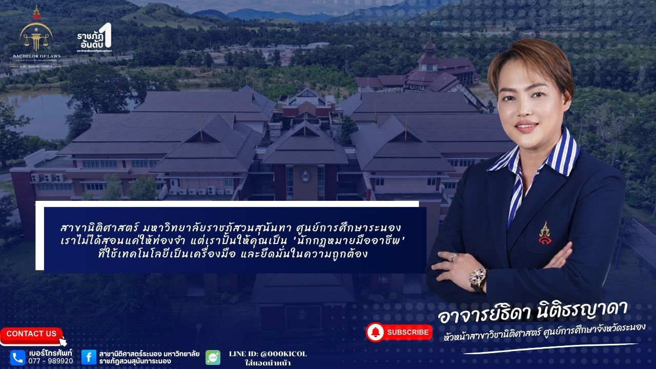 The College proudly introduces lecturer Thida Nitithornyada, Head of the Law Program at the Ranong Education Center, a legal expert with extensive knowledge and professional teaching experience. She is dedicated to delivering both theoretical and practical knowledge to enhance students’ potential and prepare them for a high-quality and sustainable career in the legal profession.