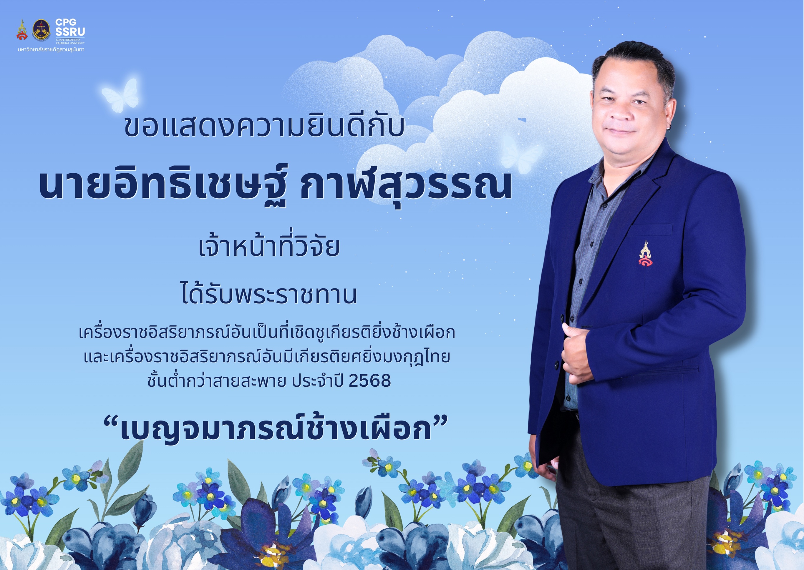 The College of Politics and Government, Suan Sunandha Rajabhat University, would like to extend its heartfelt congratulations to Mr. Ittichet Kalsuwan, Research Officer, on the occasion of being graciously bestowed with the Royal Decorations of the Most Exalted Order of the White Elephant and the Most Noble Order of the Crown of Thailand (below Knight Grand Cordon level) for the year 2025.