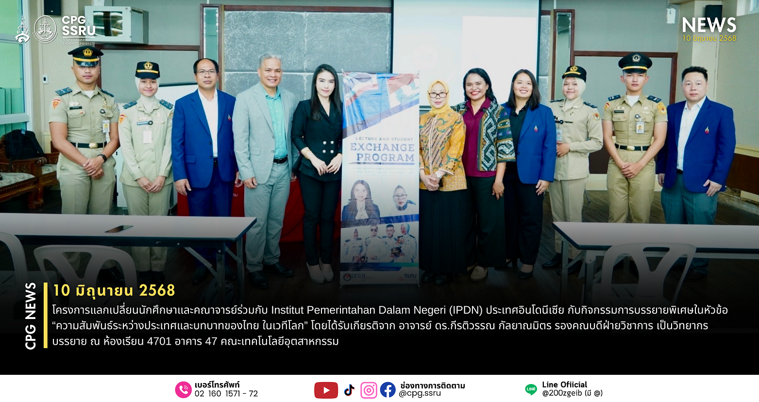 On June 10, 2025, the Research and Academic Services Department of the College of Politics and Governance, Suan Sunandha Rajabhat University, hosted a student and faculty exchange program with the Institut Pemerintahan Dalam Negeri (IPDN) from Indonesia. The program, running from June 9 to 12, 2025, at the College of Politics and Governance, aims to strengthen academic cooperation between the two institutions and promote international collaborative learning.