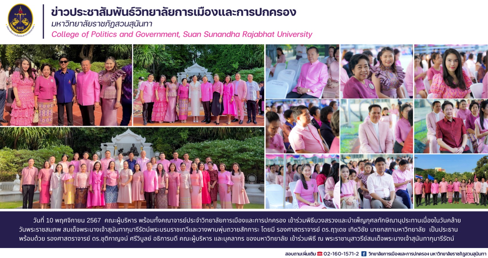 On November 10, 2024, the executives and faculty members of the College of Politics and Governance joined the ceremony to worship and make merit on the occasion of Her Majesty Queen Sunandha Kumariratana's birthday anniversary and laid a wreath to pay homage. Associate Professor Dr. Ruedet Kerdwichai, Chairman of the University Council, presided over the ceremony, along with Associate Professor Dr. Chutikarn Srivibul, President, executives and personnel of the university, who joined the ceremony at the Queen Sunandha Kumariratana Monument.