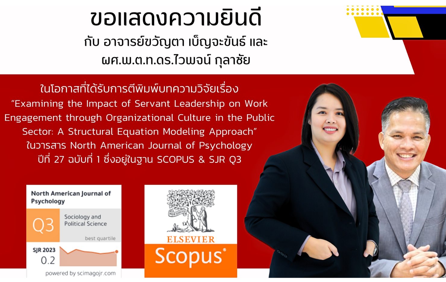 The Research and Academic Services Division, College of Politics and Government, would like to congratulate Assistant Professor Kwanta Benjakhan and Assistant Professor Police Lieutenant Colonel Dr. Waiphot Kulachai on the occasion of having their research work, “Examining the Impact of Servant Leadership on Work Engagement Through Organizational Culture in the Public Sector,” published in the North American Journal of Psychology (NAJP), Volume 27, Issue 1, which is in the SCOPUS and SJR (SCImago Journal Rank) Q3 databases.