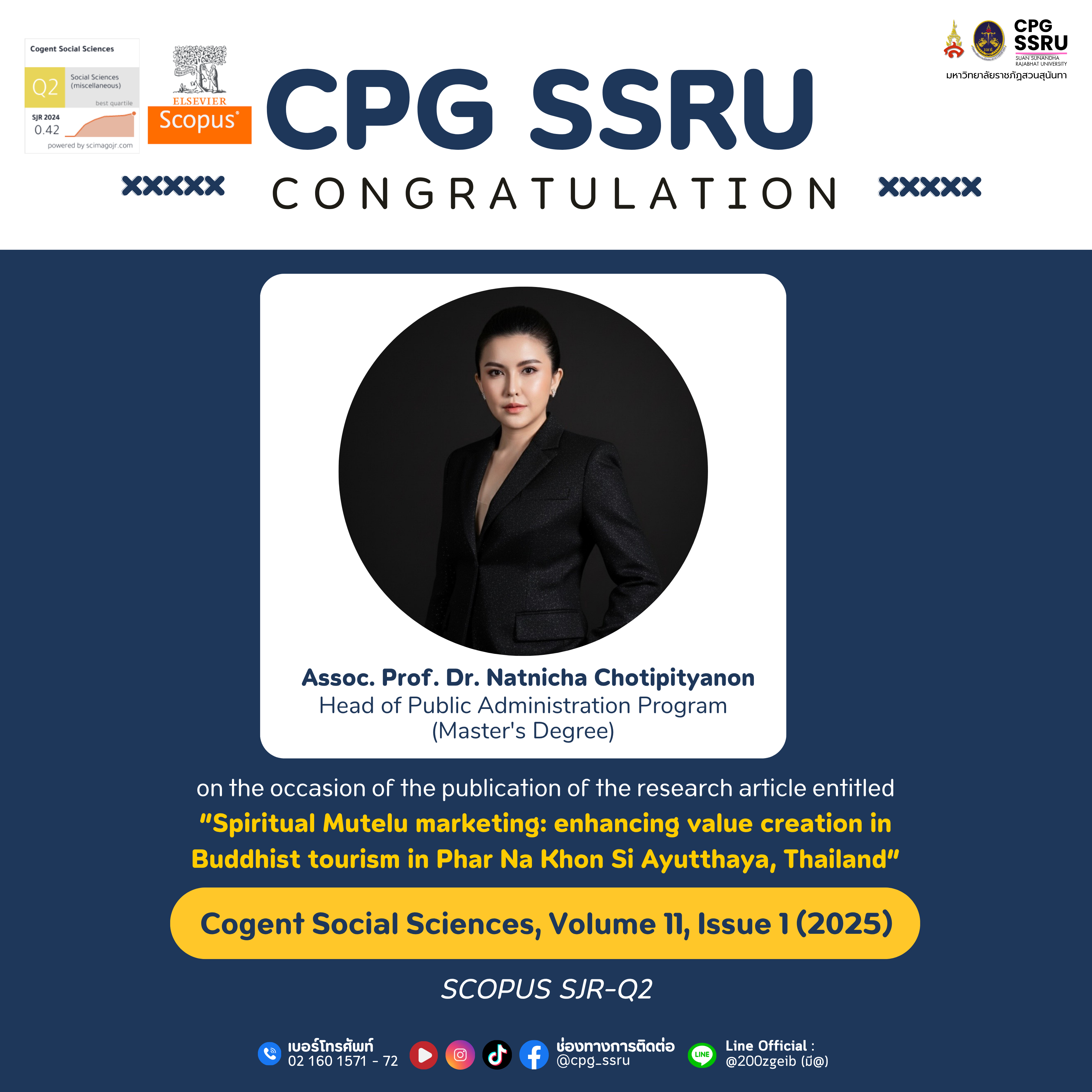The College of Politics and Government,Suan Sunandha Rajabhat University,extends its congratulations to Assoc. Prof. Dr. Natnicha Chotipityanonon the publication of her research article entitled “Spiritual Mutelu Marketing: Enhancing Value Creation in Buddhist Tourism in Phra Nakhon Si Ayutthaya, Thailand” in Cogent Social Sciences, Vol. 11, No. 1 (2025), pp. 1–17. The journal is indexed in Scopus and ranked SJR Quartile 2 (Q2).