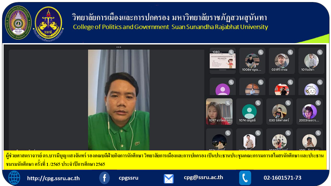 Assistant Professor Dr. Barameboon Saengchan, Associate Dean for Student Affairs College of Politics and Governance Chairman of the student club committee meeting and President of the Student Club No. 1/2565 of the academic year 2022, with a proactive public relations agenda Jointly making a memorandum of understanding with network schools and public relations for community development through volunteer projects Volunteer Camp Project to be implemented in the fiscal year 2023.