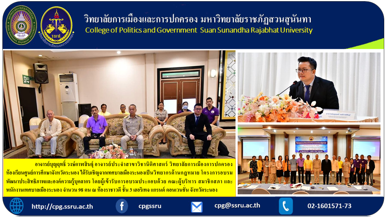 Ranong municipality invites Teacher Suan Sunandha Become a legal lecturer Ajarn Boonrit Wong Kalasin Lecturer of the Department of Law College of Politics and Governance, Ranong Education Center Classroom Invited by Ranong Municipality as a legal speaker Efficiency and knowledge development training project The participants consisted of administrators, council members and staff of Ranong Municipality, totaling 98 people, at Rachawadee Room, 3rd floor, Heritage Grand Convention, Ranong Province . Ranong is a local protective organization whose mission covers all fields. for local development to progress especially public service operations has the ultimate goal of providing service is primarily the satisfaction and benefit of the people.Therefore, the personnel under the municipality It is the heart and core that is important in driving various missions to achieve success. And the management of the organization will develop with efficiency and maximum effectiveness. It is essential to have competent human resources. All personnel in the department therefore need to develop their own potential to increase their knowledge, skills and experience in working continuously and consistently.