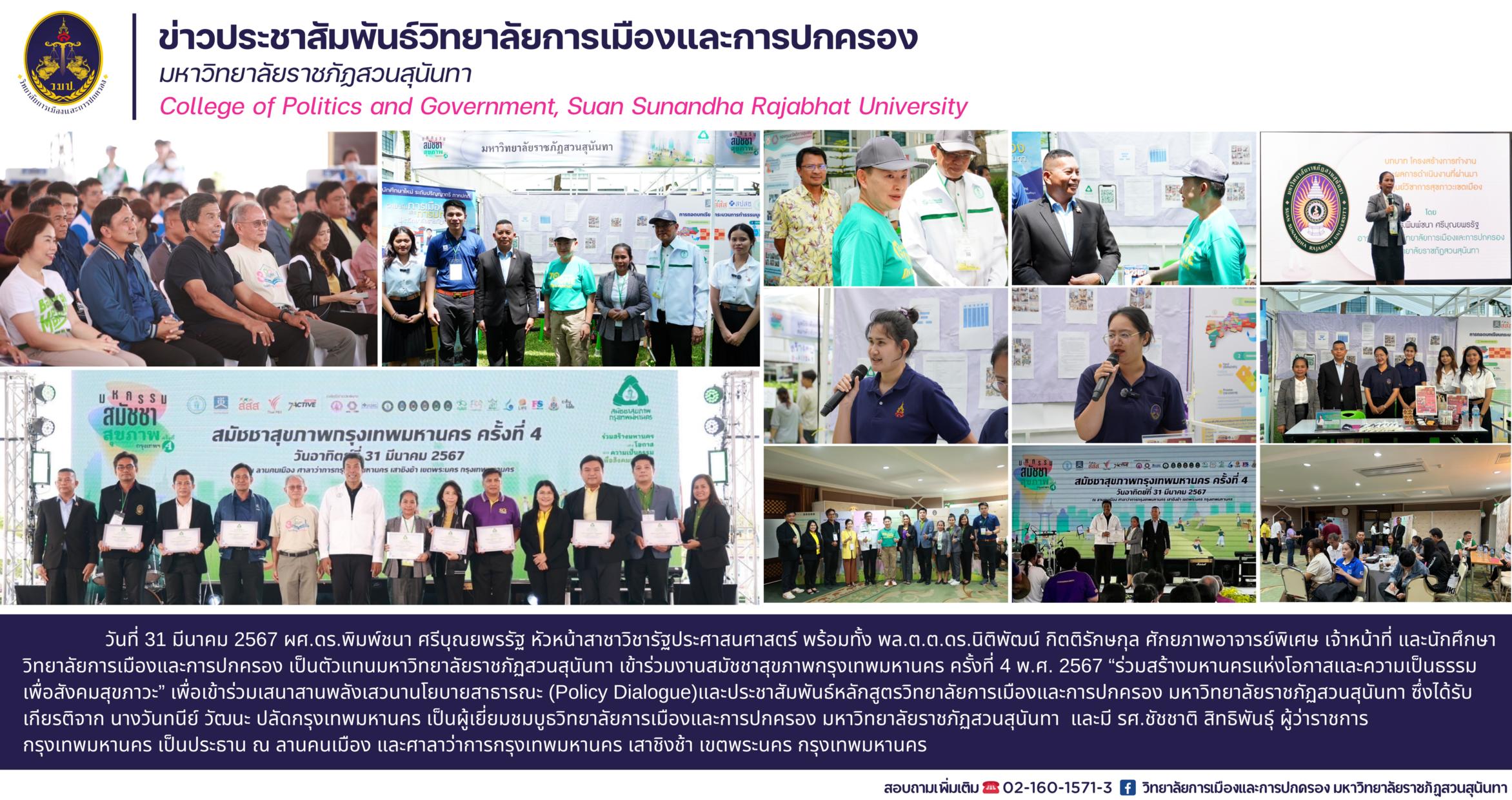On March 31, 2024, Assistant Professor Dr. Pimchana Sribunyaphonrat, Head of the Department of Public Administration, along with Pol. Maj. Gen. Dr. Nitipat Kittiraksakul, potential special lecturers, officials, and students of the College of Politics and Governance. Representing Suan Sunandha Rajabhat University Participated in the 4th Bangkok Health Assembly 2024 “Join in creating a city of opportunity and fairness. For a Healthy Society” to participate in the Public Policy Dialogue (Policy Dialogue), in which Suan Sunandha Rajabhat University is one of the network partners of 5 Rattanakosin Rajabhat Universities in Bangkok, as well as publicizing the College of Politics and Governance curriculum. Suan Sunandha Rajabhat University which was honored by Mrs. Wanthanee Watthana, Permanent Secretary of Bangkok Being a visitor to the College of Politics and Government booth Suan Sunandha Rajabhat University and Associate Professor Chatchart Sitthiphan, Governor of Bangkok, presided over at the city square and Bangkok City Hall, Giant Swing, Phra Nakhon District, Bangkok.