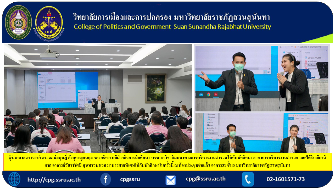 December 9, 2022 at 1:00 p.m. Assistant Professor Dr. Jetsarit Angsu Kanchanakul Vice President for Student Affairs Lectures on seminars on police administration to students Department of Police Administration and was honored by Ajarn Watcharas Soonthornwanawet gave a special lecture to the students this time at Chorkaew Conference Room, Building 31, Floor 5, Suan Sunandha Rajabhat University.