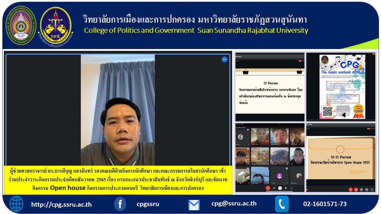 Assistant Professor Dr. Barameeboon Saengchan, Deputy Dean for Student Affairs and the student club committee Participate in the agenda for December 2022 activities on public relations guidance in Singburi and Chainat provinces, Open house activities, Music contest activities College of Politics and Governance.