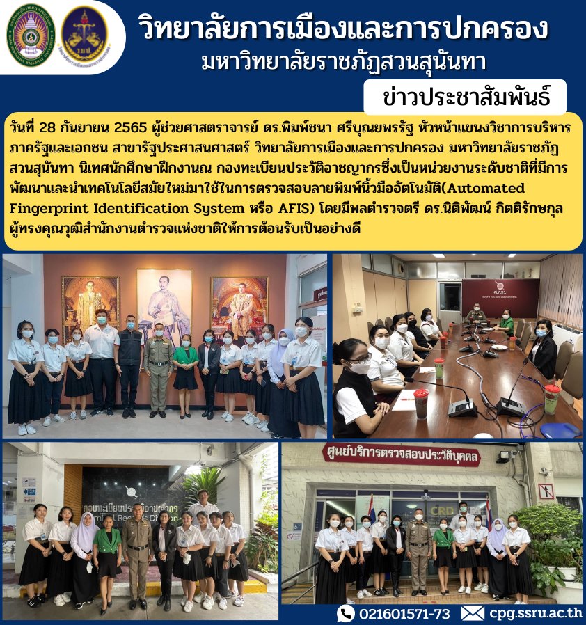 On September 28, 2022, Assistant Professor Dr. Pimchana Sribunyapornrat, Head of the Department of Public and Private Administration Public Administration College of Politics and Governance Suan Sunandha Rajabhat University Supervise students internships at Criminal Records Registration Division, a national agency that has developed and applied modern technology to detect fingerprints automatically (Automated Fingerprint Identification System (AFIS) with Police Major General Dr. Nitipat Kittiraksakul The experts from the Royal Thai Police gave a very warm welcome.