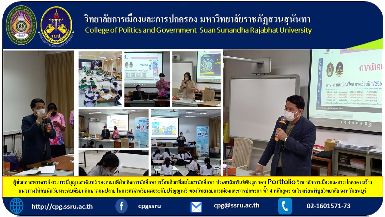Assistant Professor Dr. Barameeboon Saengchan, Deputy Dean for Student Affairs along with the student club team Proactive public relations around the Portfolio College of Politics and Government Guidelines for high school students To apply for a bachelor's degree of the College of Politics and Government, all 4 courses at Phibun Wittayalai School Lopburi Province.