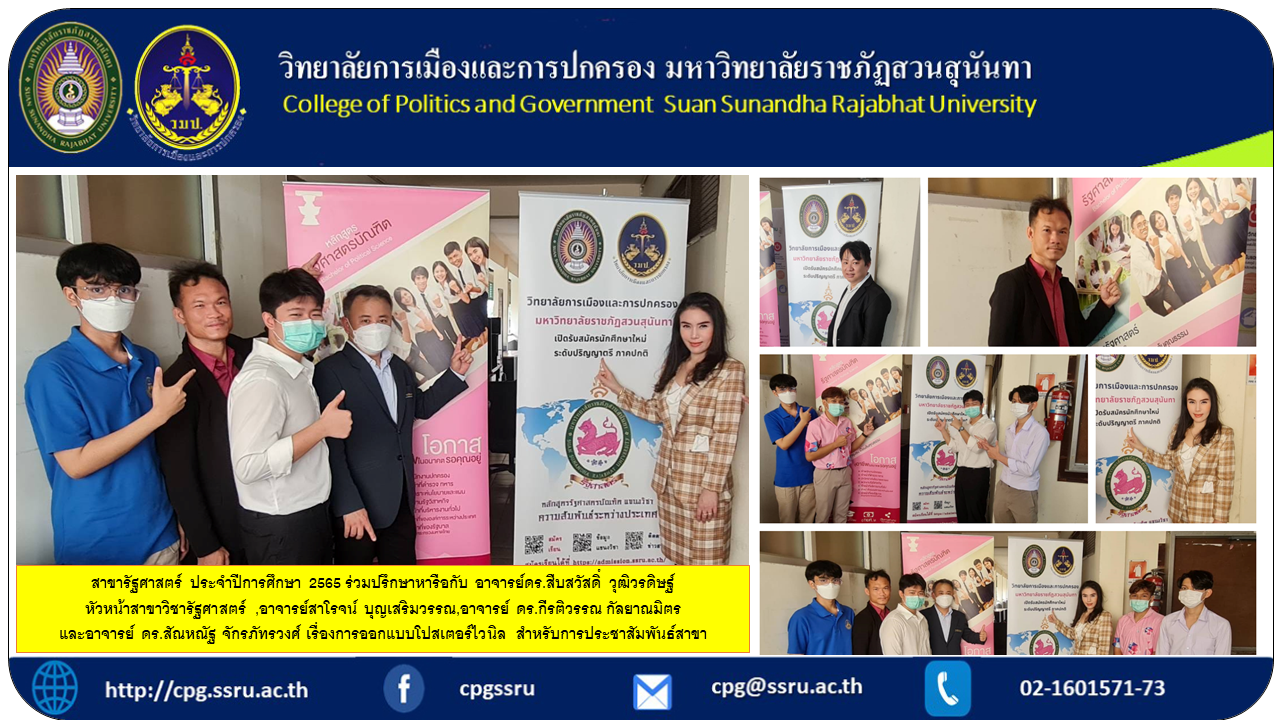On October 26, 2022 at 2:00 p.m. President of Political Science for the academic year 2022, jointly consult with Dr. Suebsawad Wuthiwradit, Head of Political Science Department , Master Saroj Boonsermwan, Ajarn Dr. Kiratiwan Kalayanamit and Ajarn Dr. Sanhanut Chakraphatwong on the design of vinyl posters. for public relations.
