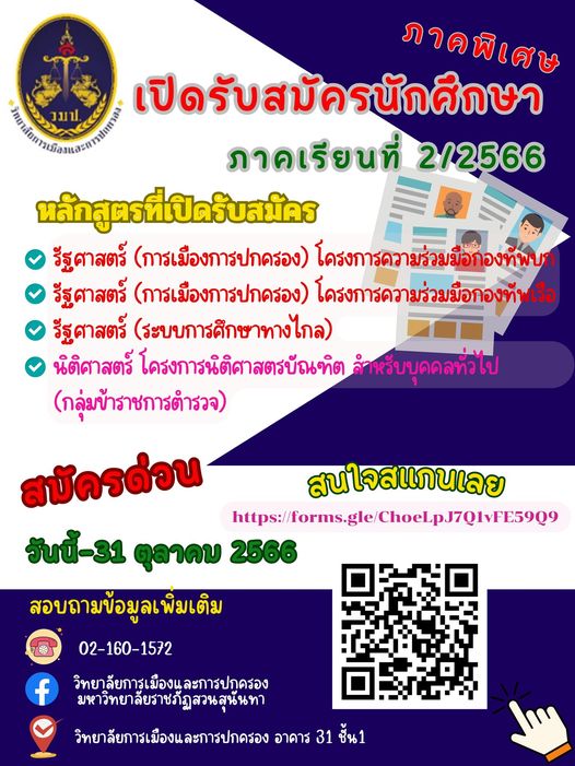 College of Politics and Government Recruiting for the entrance exam to study at the bachelor's degree level (special section) for the second semester of academic year 2023. There are 2 courses: Bachelor of Political Science Program, Political Science (Politics and Government), Army Cooperation Project, Political Science (Politics and Government), Navy Cooperation Project, Political Science (Distance Education System), Bachelor of Laws Program, Law (2nd Bachelor's Degree) , Law, Law Program graduate For the general public (Police Civil Service Group) recruiting students through the internet athttps://forms.gle/ChoeLpJ7Q1vFE59Q9