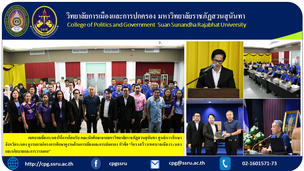 today (2 Sep. 2023) at 9:00 a.m. at Rattanarangsan Conference Room, 3rd floor, Ranong Municipality, Mr. Phinit Tankun, Mayor of Ranong, Mr. Somchai Saibua, Deputy Mayor of Ranong, along with the executive team, heads of government agencies. official welcome Group of students from Suan Sunandha Rajabhat University Ranong Provincial Education Center View work according to the study tour project on politics and government, topic "Ranong Municipality Structure and Policy and Planning".