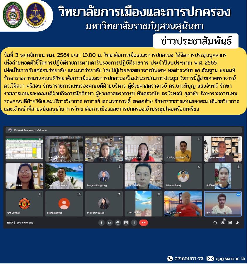 November 3, 2021 at 1:00 p.m. College of Politics and Administration held a staff meeting To convey the performance indicators according to the performance certification Fiscal Year 2022 to drive the college and university Assistant Professor, Lieutenant General Dr. Santhan Chayanon, Acting Dean of the College of Politics and Administration, presided over the meeting. In this regard, Assistant Professor Dr. Wichitra Srison, Acting Deputy Dean for Administration Assistant Professor Dr. Baramebun Saengchan, Acting Deputy Dean for Student Affairs Assistant Professor, Lieutenant Colonel Dr. Waiphot Kulachai, Acting Associate Dean for Research and Academic Services, Lecturer Dr. Montakarn Rodklai, Acting Deputy Dean for Academic Affairs and academic support staff of the College of Politics and Administration attended the meeting in unison.