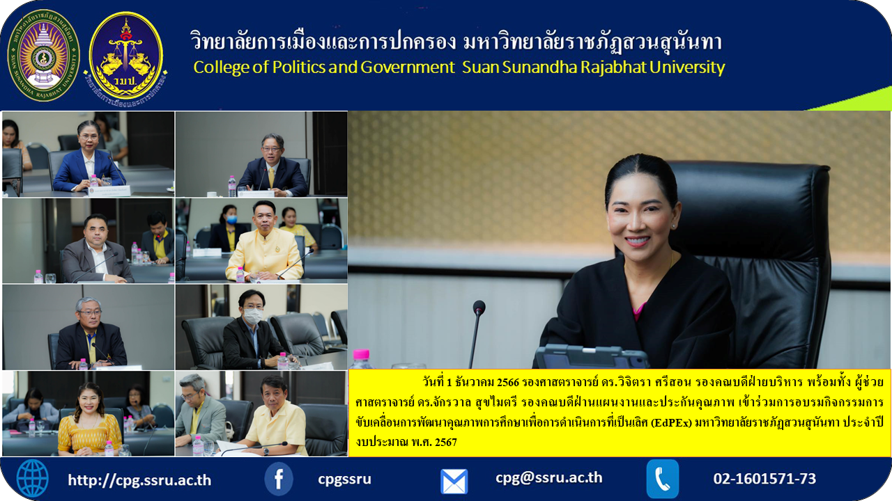 On December 1, 2023, Associate Professor Dr. Wichitra Srisorn, Deputy Dean for Administration, along with Assistant Professor Dr. Chakkawan Sukmaitri, Deputy Dean for Planning and Quality Assurance. Participated in training activities to drive the development of educational quality for excellence (EdPEx), Suan Sunandha Rajabhat University. Fiscal year 2024, which was honored by Associate Professor Dr. Pharmacist Sompop, Chairman of Thurarak As a lecturer on the topic "Learn the EdPEX criteria: from theory to practice" with Assoc. Prof. Dr. Chutikarn Sriwiboon, President of Suan Sunandha Rajabhat University, presided over the University Council meeting room, 5th floor, Building 31, Suan Sunandha Rajabhat University.
