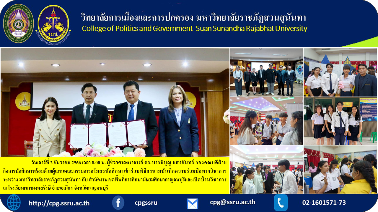 Saturday, December 2, 2023 at 8:00 a.m., Assistant Professor Dr. Barameebun Saengchan, Deputy Dean for Student Affairs, along with representatives of the Student Club Committee attended the signing ceremony of the academic cooperation memorandum between Suan Sunandha Rajabhat University and the Office of Educational Service Area Office. Study secondary school in Kanchanaburi and open academic houses At Thep Mongkol Rangsi School, Mueang District, Kanchanaburi Province with Assistant Professor Dr. Kaenphet Sarayanathawat, Vice President, Nakhon Pathom Campus, as chairman. along with executives Faculty and staff of each college participated in the activity in unison.