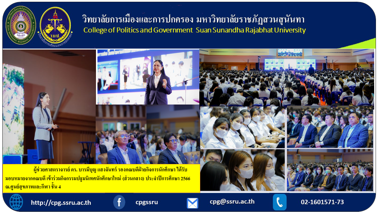 Monday 3 July 2023 at 9:00 a.m. Assistant Professor Dr. Barameeboon Saengchan, Deputy Dean for Student Affairs Assigned by the Dean Participate in new student orientation activities (central) for the academic year 2023 at the Health and Sports Center, 4th floor, with Associate Professor Chutikan Sriwiboon, the President as president, and administrators from each faculty and college attended in unison.