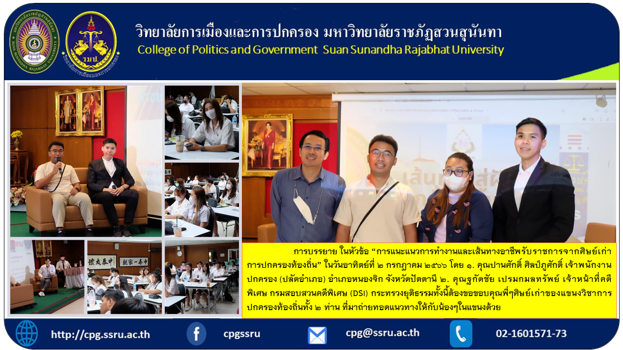A collection of pictures of lectures on the topic of "Guidelines for work and career paths in government service from local government alumni" on Sunday, July 2, 2023 by 1. Mr. Parnsak Silphusak. Administrative official (district deputy), Nong Chik District, Pattani Province 2. Mr. Thakatchai Premkamonsap Special Case Officer Department of Special Investigation (DSI), Ministry of Justice In this regard, I would like to thank the 2 alumni of the local government department who came to convey the guidelines to the children in the field.