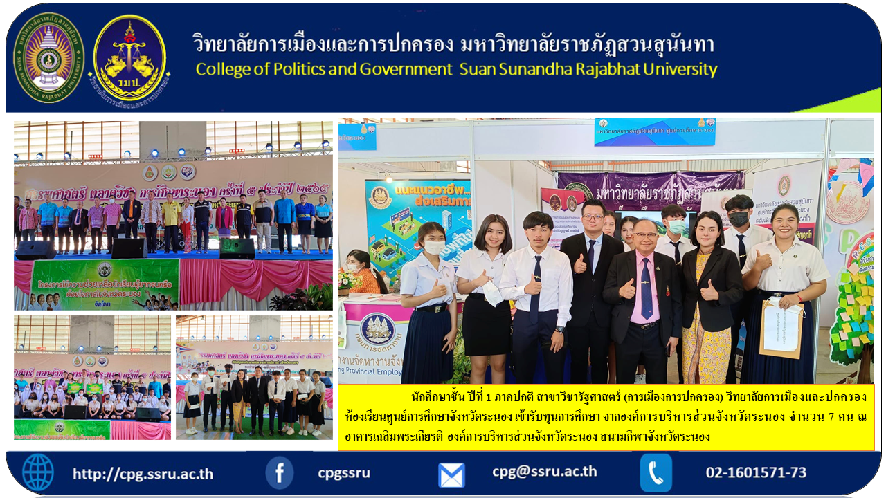 1st year student, normal program, Political Science major (Politics and Governance) College of Politics and Governance Classroom, Ranong Education Center receive a scholarship From the Provincial Administrative Organization of Ranong, 7 people at the Chalerm Phrakiat Building Ranong Provincial Administrative Organization Ranong Province Stadium.