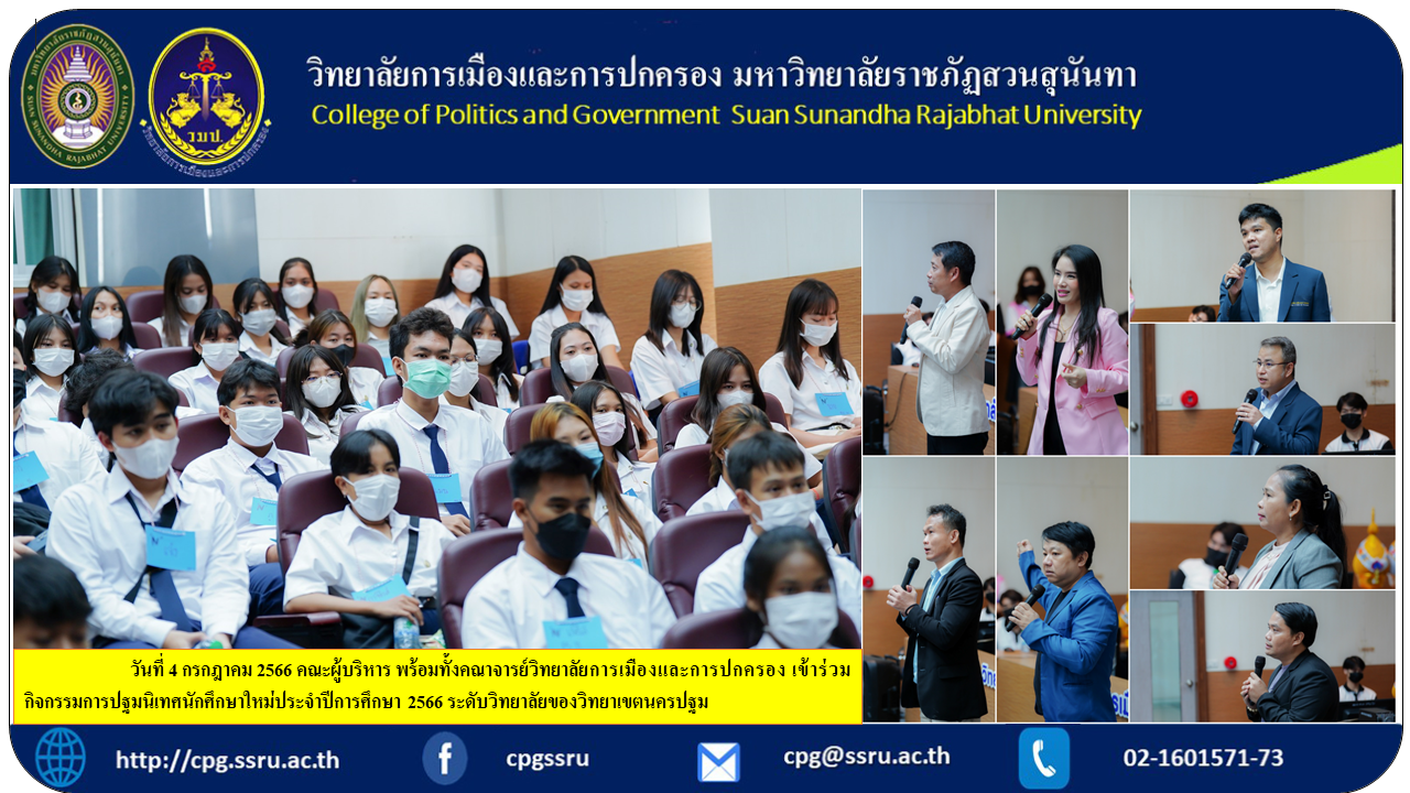 On July 4, 2023, the management team along with faculty members of the College of Politics and Governance Participate in new student orientation activities for the academic year 2023 at the college level of Nakhon Pathom Campus at the integrated classroom building and food center, lecture room, 1st floor, Suan Sunandha Rajabhat University. Nakhon Pathom Campus.