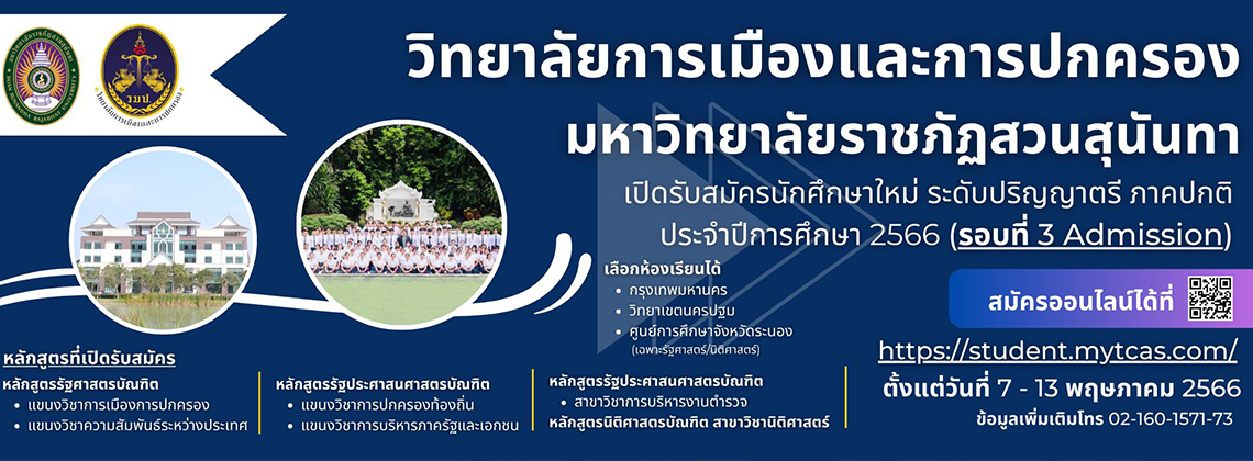 College of Politics and Governance Suan Sunandha Rajabhat University Open for new students Undergraduate level, normal program , academic year 2023 (Round 3 Admission) from 7 - 13 May 2023, apply online at the website https://student.mytcas.com/ - Courses open for applications -- Bachelor of Political Science Program --- Politics and Government --- International Relations Program -- Bachelor of Public Administration Program Public Administration --- Local Administration ---- Public and Private Administration -- Bachelor of Laws Program -- Bachelor of Public Administration Program Department of Police Administration -- choose a classroom for every course --- Bangkok Classroom--- Nakhon Pathom Campus Classroom Learn more at the website. www.cpg.ssru.ac.th Facebook College of Politics and Governance Suan Sunandha Rajabhat University Tel. 02-160-1571-73 College of Politics and Governance Suan Sunandha Rajabhat University, No. 1, U Thong Nok Road, Dusit Subdistrict, Dusit District, Bangkok Postal Code 10300