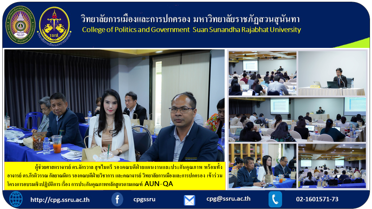 On April 5, 2023, Assistant Professor Dr. Jakrawan Sukmaitri, Associate Dean for Planning and Quality Assurance, together with Ajarn Dr. Keeratiwan Kalayanamit, Associate Dean for Academic Affairs and faculty members of the College of Politics and Governance Participated in a workshop on quality assurance for curriculum according to AUN-QA criteria. Assistant Professor Nimit Mengveha, Associate Dean for Planning and Quality Assurance Faculty of Architecture and Design as a lecturer by King Mongkut's University of Technology Thonburi, with Associate Professor Dr. Nantiya Noichan, Vice President for Academic Affairs was the chairman of the project at Chorkaew Conference Room, 5th Floor, Building 31, Suan Sunandha Rajabhat University.