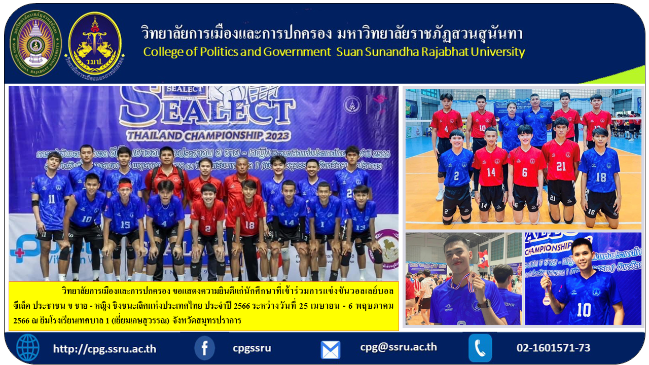 College of Politics and Governance Congratulations to the students who participated in the Volleyball Select People B Male - Female Final of Thailand 2023 between April 25 - May 6, 2023 at the municipal school gym 1 (Yai Ket Suwan), Samut Prakan Province. 2nd runner-up male team type, Suan Sunandha University For students representing the competition political science student Royal Thai Army Cooperation Projects: 1. Sgt. Col. Ratchanon Chaichalasang 2. Sgt. Sgt. Kiattisak Srikham 3. Mr. Noraphat Kaewpatsin.