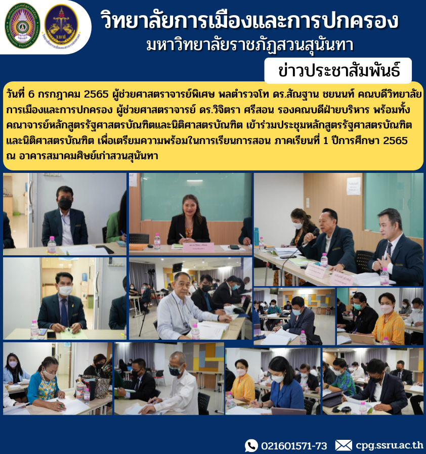 On July 6, 2022, Assistant Professor, Police Lieutenant General Dr. Santhan Chayanon, Dean of the College of Politics and Administration Assistant Professor Dr. Wichitra Srison, Associate Dean for Administration along with the faculty of the Bachelor of Political Science and the Bachelor of Laws program Attending the bachelor of political science course and Bachelor of Laws To prepare for teaching in the first semester of the academic year 2022 at the Suan Sunandha Alumni Association building..