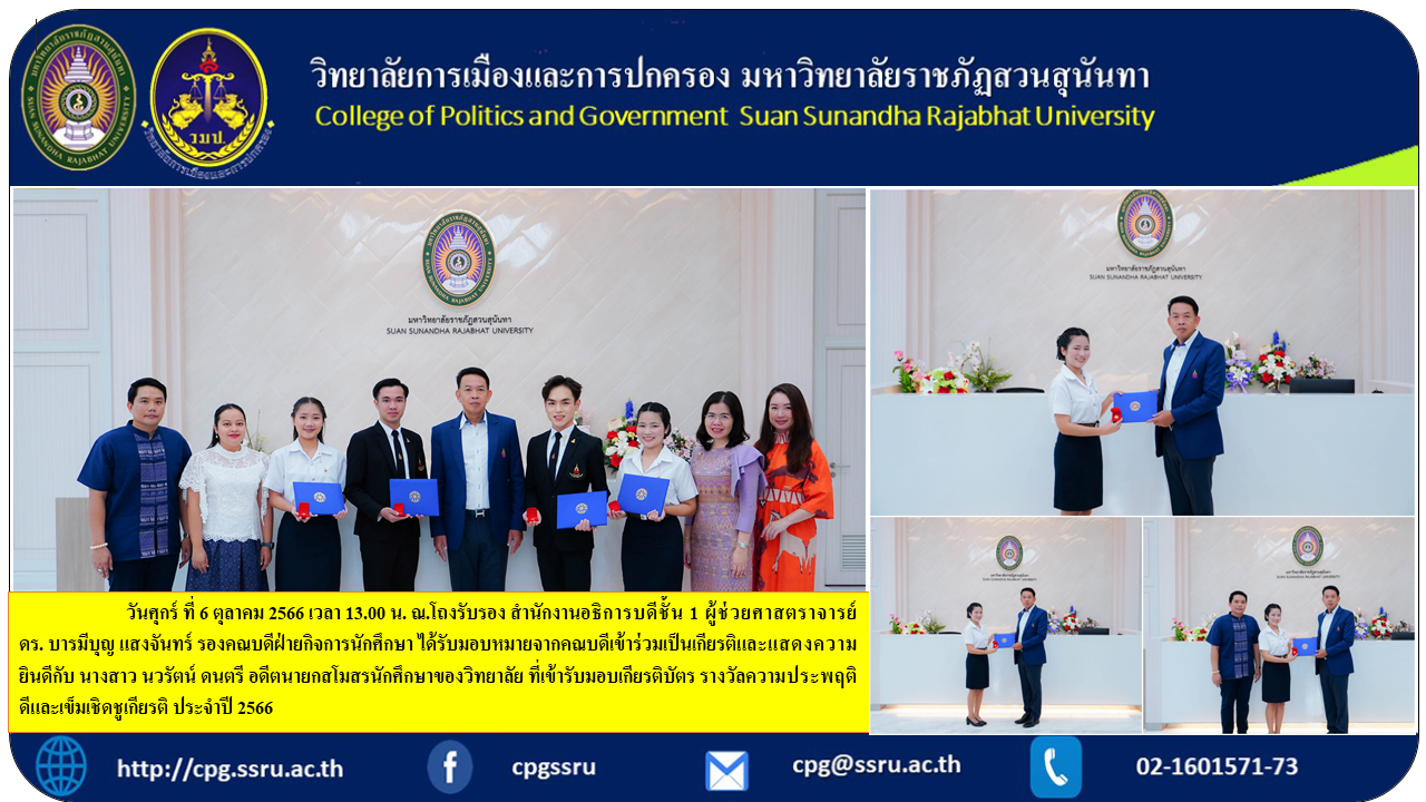 Friday, October 6, 2023 at 1:00 p.m. at the reception hall, Office of the President, 1st floor, Assistant Professor Dr. Barameebun Saengchan, Deputy Dean for Student Affairs Was assigned by the dean to honor and congratulate Ms. Nawarat Donthri, former president of the college's student club. who received a certificate of honor Good Conduct Award and Pin of Honor for the year 2023 of the Buddhist Association of Thailand under royal patronage with Assistant Professor Dr. Chetsarit Angsukanjanakul Vice President for Student Affairs is the chairman.