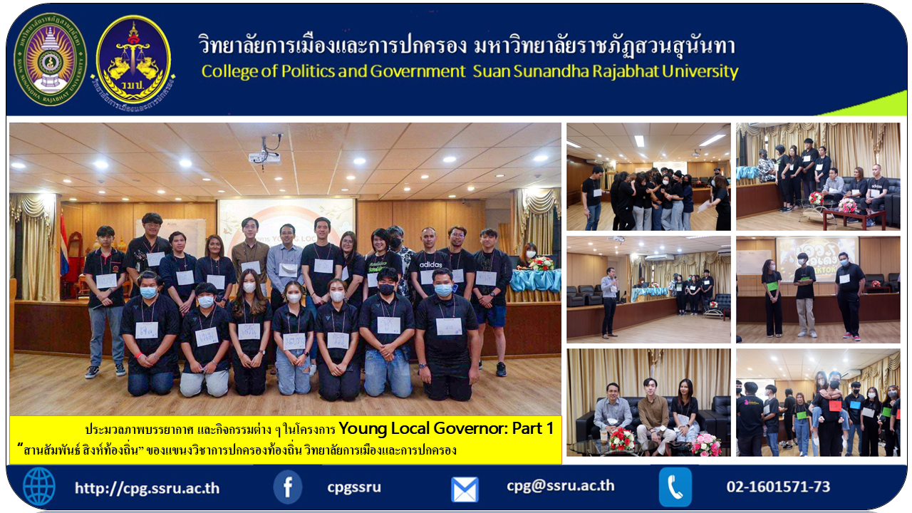The image processing and various activities in the Young Local Governor: Part 1 project "Building a relationship with local lions" of the academic branch of local government College of Politics and Governance for this project The objective is to strengthen leadership. and management skills for student organization Let the project participants practice working together as a team. through workshop activities That has actually been done at the same time, it also aims to answer the question of building relationships between students in each year. tightly together again Welcome back to study in the full classroom. After the past COVID-19 crisis, this opportunity, on behalf of the project organizing committee, (Students) I would like to thank the lecturer Arada Adulphichit and the team, the faculty, and most importantly, my dear friends and students in the field of local administration. for working together to make the project in Part 1 successfully completed