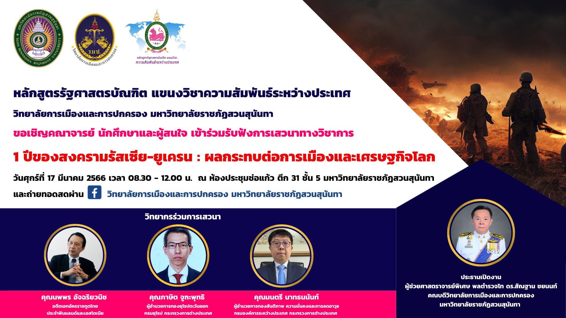 Bachelor of Political Science Program Department of International Relations College of Politics and Governance Suan Sunandha Rajabhat University invite faculty Students and interested people Participate in an academic discussion on the 1st Year of the Russo-Ukrainian War: Impact on Politics and World Economy Friday, March 17, 2023, from 8:30 a.m. - 12:00 noon, at Chor Kaew Conference Room, Building 31, 5th floor, Suan Sunandha Rajabhat University. And broadcast live via Facebook Page College of Politics and Governance Suan Sunandha Rajabhat University.