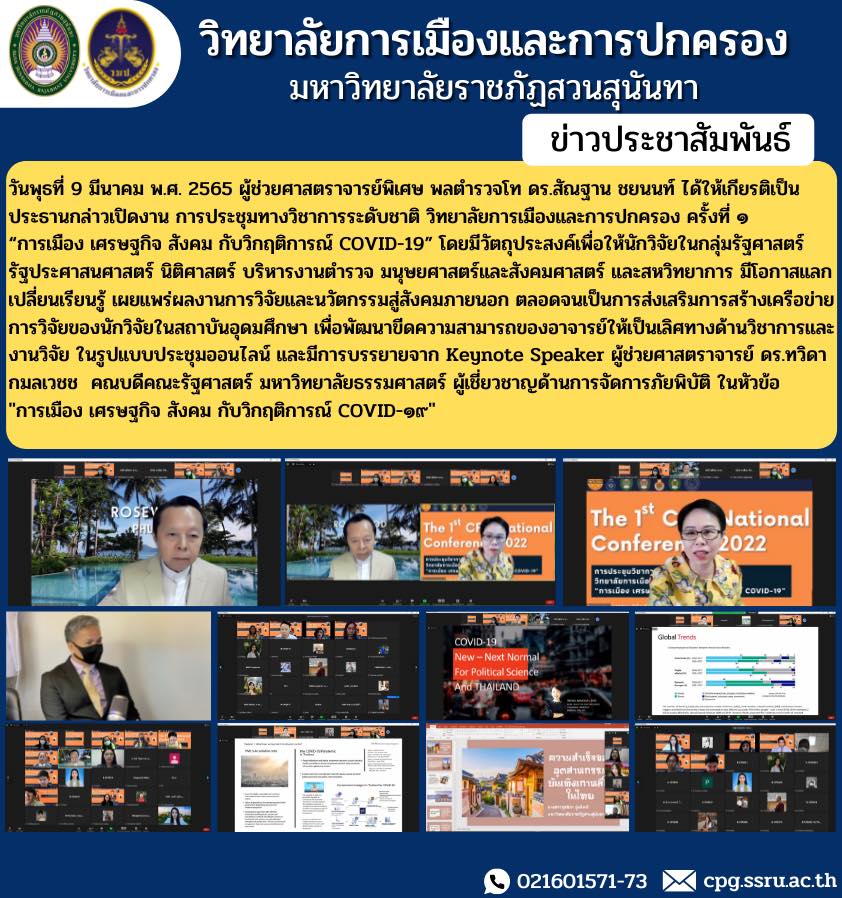 Wednesday, March 9, 2022, Assistant Professor, Police Lieutenant General Dr. Santhan Chayanon presided over the opening remarks. national academic conference College of Politics and Governance No. 1 "Politics, Economy, Society and the COVID-19 Crisis" with the objective of enabling researchers in the political science group to Public Administration, Law, Police Administration Humanities and Social Sciences and interdisciplinary have the opportunity to exchange knowledge Disseminate research results and innovations to the outside society. as well as to promote the creation of research networks of researchers in higher education institutions To develop the capability of teachers to be excellence in academics and research in the form of an online meeting and there was a keynote speaker, Assistant Professor Dr. Tawida Kamolvej, Dean of the Faculty of Political Science. Thammasat University Disaster Management Specialist on the topic "Politics, Economy, Society and the COVID-19 Crisis.