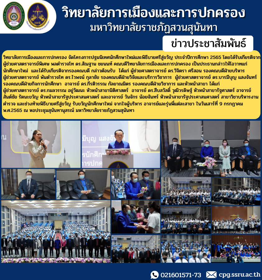 College of Politics and Governance Organize a new student orientation program and the Bai Sri Su Kwan ceremony for the academic year 2022, with honors from Assistant Professor, Police Lieutenant General Dr. Santhan Chayanon, Dean of the College of Politics and Administration The chairman gave the sermons to the new students. and was honored by the Associate Dean to give a welcome speech, including Assistant Professor Dr. Wichitra Srison, Associate Dean for Administration. Assistant Professor, Police Lieutenant Colonel Dr. Waiphot Kulachai, Associate Dean for Research and Academic Services Assistant Professor Dr. Barameebun Saengchan, Associate Dean for Student Affairs, Lecturer Dr. Kiratiwan Kanlayanamit, Associate Dean for Academic Affairs and the head of the branch, namely Assistant Professor Dr. Kamolwan Yuwattana, head of the law branch, professor Dr. Suebsawad Wuthiworadit, Head of Political Science, Ajarn Sanchai Rattanakwan, Head of Public Administration, and Ajarn Wanchak Noichan, Head of Public Administration. Police Administration and at the end of the Bai Sri Su Kwan ceremony new student gift from the heart of management Teachers and seniors in each branch On Saturday, July 9, 2022 at Sunanthanusorn Auditorium Suan Sunandha Rajabhat University.