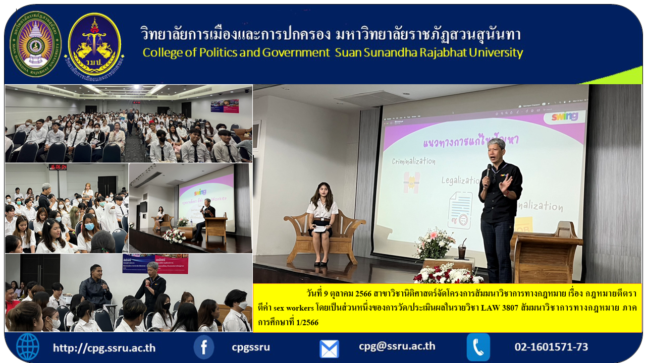 On October 9, 2023, the Department of Law organized a legal academic seminar on the topic of laws that stigmatize and value sex workers as part of the measurement/evaluation in the course LAW 3807 Legal Academic Seminar. Semester 1/2023, it was an honor to have Mr. Chamrong Paengnongyang, Vice President of the SWING Foundation, as a speaker.