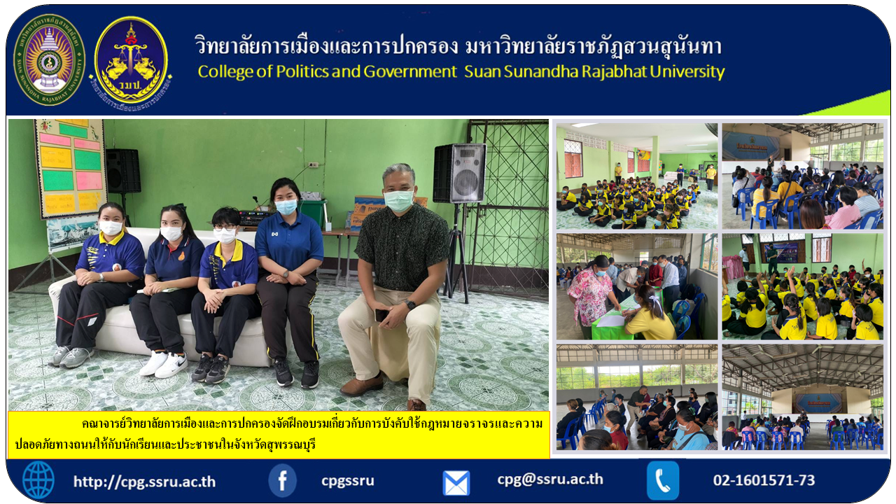 On January 11, 2023, Assistant Professor Police Lieutenant Colonel Dr. Waiphot Kulachai, Associate Dean for Research and Academic Services, College of Politics and Government, Suan Sunandha Rajabhat University organized training to educate students and the public about knowledge of law enforcement and road safety (speeding, drunk driving, helmet, red light running, and seatbelt) at Wat Khao Phra School Suphanburi Province. This project entitled “Knowledge Management and Research Transfer Project on Law Enforcement and Road Safety (Pilot Project in Suphanburi Province)” was funded by the National Research Council of Thailand (NRCT). The objective of this project is to transfer the knowledge of traffic law and road safety and push knowledge on traffic law enforcement and road safety to be widely expanded through network partners and other stakeholders. On this occasion, there were 48 students and 35 residents attending this training.