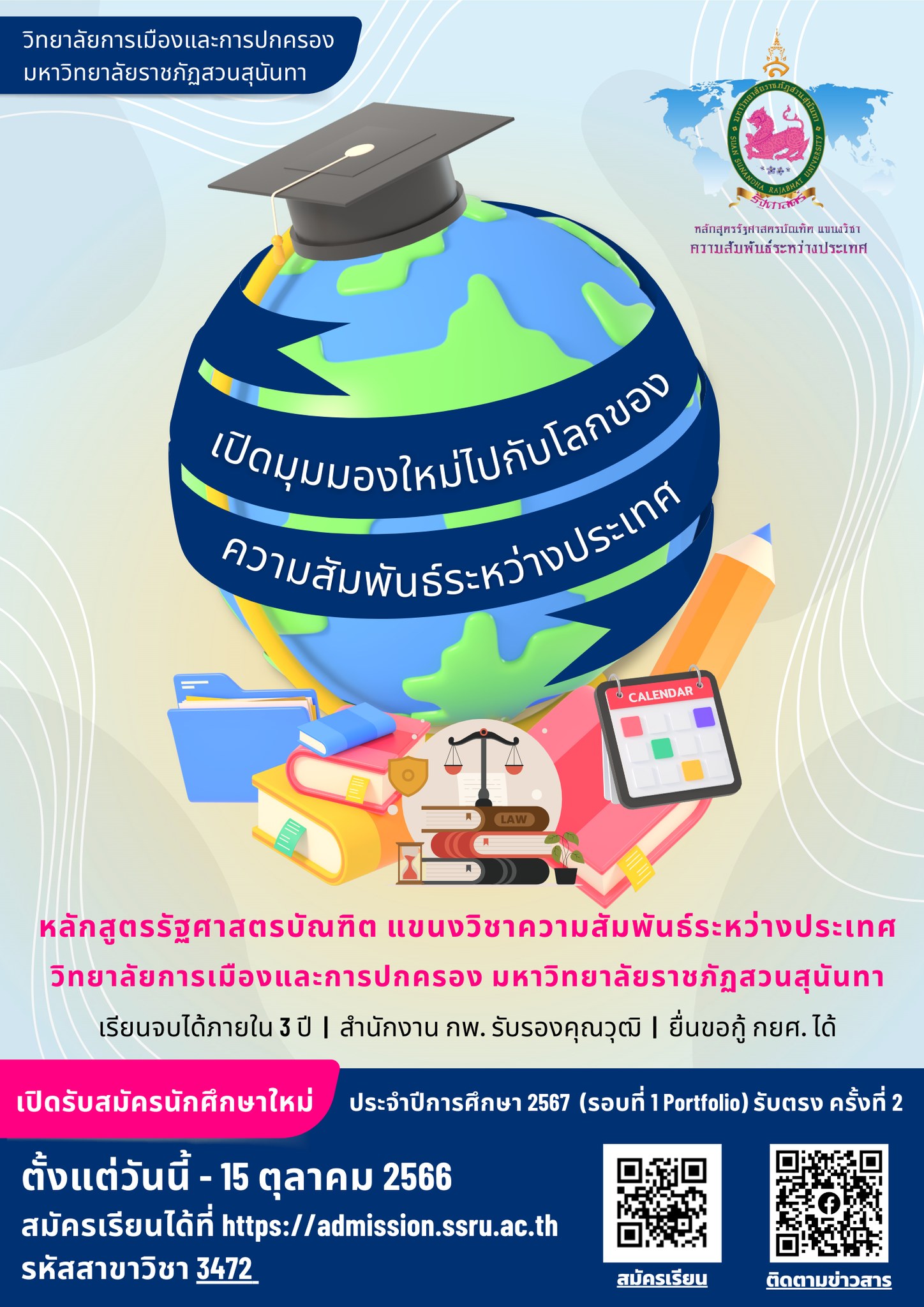 Bachelor of Political Science Program Field of Study: International Relations College of Politics and Government Suan Sunandha Rajabhat University Applications open for new students, bachelor's degree, regular semester, academic year 2024 (Round 1 Portfolio), 2nd direct admission, apply via the Internet at https://admission.ssru.ac.th/