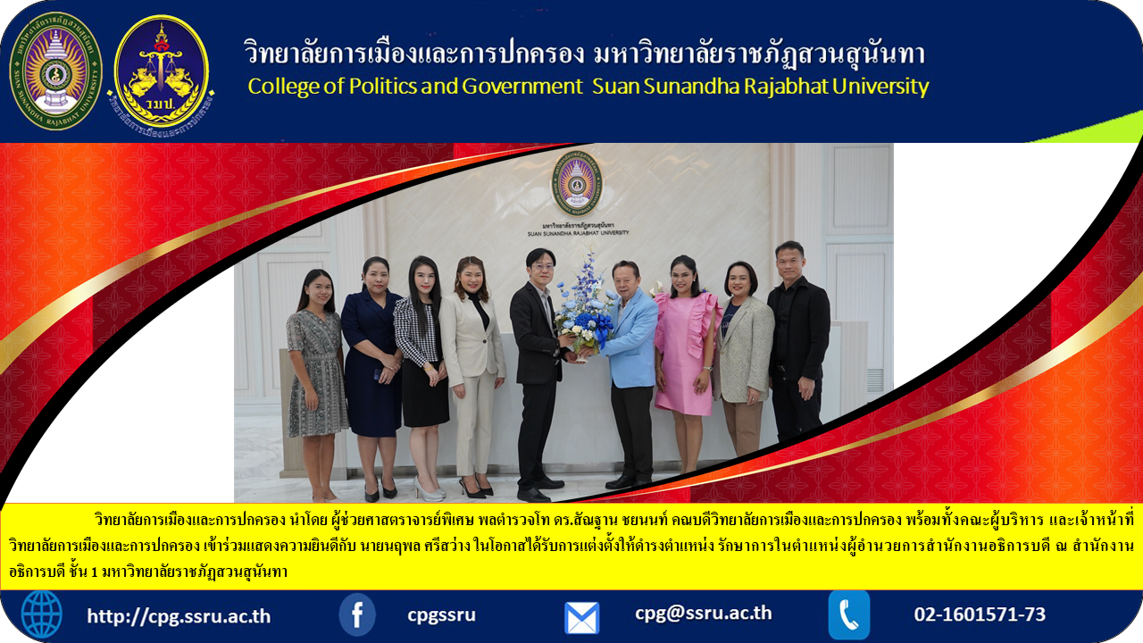 College of Politics and Governance, led by Special Assistant Professor Police Lieutenant General Dr. Santhan Chayanont, Dean of the College of Politics and Governance. along with the executive team and officials of the College of Politics and Government Join in congratulating Mr. Naruephon Srisawang on the occasion of being appointed to the position. Acting in the position of Director of the Office of the President at the Office of the President, 1st floor, Suan Sunandha Rajabhat University.