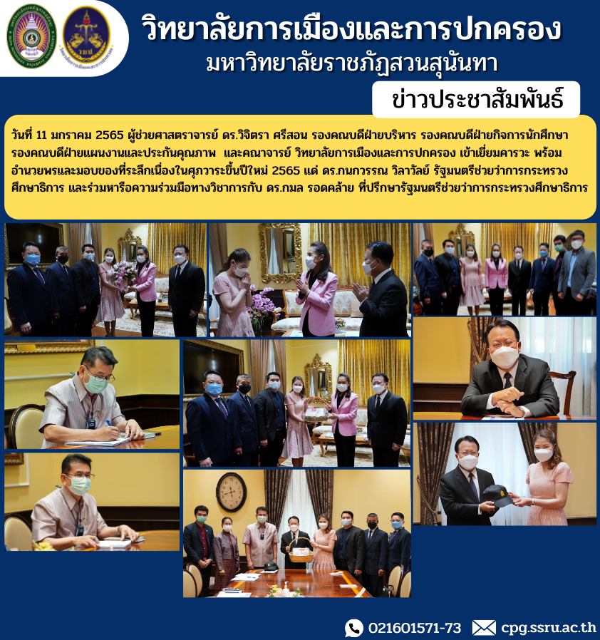 On January 11, 2022, Assistant Professor Dr. Wichitra Srison, Associate Dean for Administration Deputy Dean for Student Affairs Deputy Dean for Planning and Quality Assurance and faculty member, College of Politics and Governance pay a visit with blessings and giving souvenirs on the occasion of the New Year's Eve 2022 to Dr. Kanokwan Wilawan, Deputy Minister of Education and jointly discussed academic cooperation with Dr. Kamol Rodklai, Advisor to the Deputy Minister of Education.