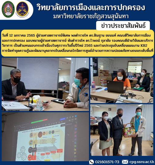On January 12, 2022, Assistant Professor, Police Lieutenant General Dr. Santhan Chayanon, Dean of the College of Politics and Administration Assign Assistant Professor, Police Lieutenant Colonel Dr. Waiphot Kulachai, Associate Dean for Research and Academic Services. representing the handing of baskets on the occasion of the New Year's Day 2022 and joining the meeting to drive the KR2 plan, creating a knowledge set and developing personnel to drive the management mechanism of the road safety center at the local level.