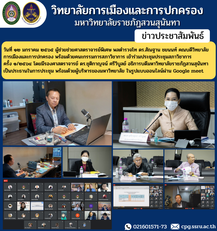 On January 12, 2012, Assistant Professor Assistant Lieutenant General Dr. Santhan Chayanon, Dean of the College of Politics and Administration along with members of the Academic Council Attended the Academic Council Meeting No. 1/2021 with Associate Professor Dr. Chutikarn Sriwiboon, President of Suan Sunandha Rajabhat University presided over the meeting along with university administrators in an online format via Google meet.