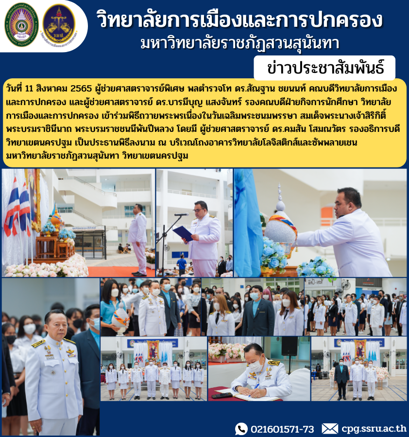 On August 11, 2022, Assistant Professor, Police Lieutenant General Dr. Santhan Chayanon, Dean of the College of Politics and Administration and Assistant Professor Dr. Barameboon Saengchan, Associate Dean for Student Affairs College of Politics and Governance Attending the Blessing Ceremony on the occasion of His Majesty the King's Birthday Her Majesty Queen Sirikit Her Majesty the Queen His Majesty the King, with Assistant Professor Dr. Komsan Somanwat, Vice President of Nakhon Pathom Campus presided over the signing ceremony at the Hall of the College of Logistics and Supply Chain Suan Sunandha Rajabhat University Nakhon Pathom Campus.