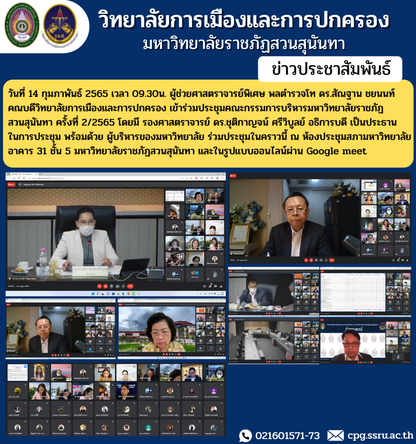 On February 14, 2022 at 09.30, Assistant Professor, Lieutenant General Dr. Santhan Chayanon, Dean of the College of Politics and Administration Attended the Executive Committee Meeting of Suan Sunandha Rajabhat University No. 2/2565 with Associate Professor Dr. Chutikarn Sriwiboon, President, presided over the meeting along with the university administrators. Attended this meeting at the University Council Meeting Room, Building 31, Floor 5, Suan Sunandha Rajabhat University. and in online format via Google meet.