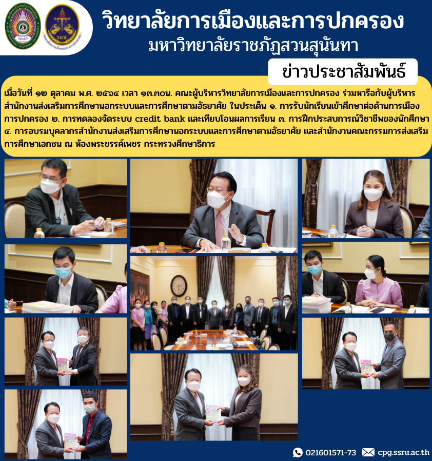On October 12, 2021, at 1:30 p.m., the College of Politics and Administration Participated in discussions with the administrators of the Office of Non-Formal and Informal Education on issues 1. Admission of students for further studies in politics and administration 2. An experiment on credit bank system arrangement and transfer of academic results 3. Vocational experience training of students 4. Personnel training of the Office of Non-Formal and Informal Education Promotion and the Office of the Private Education Commission at Phra Khan Petch Room Ministry of Education.