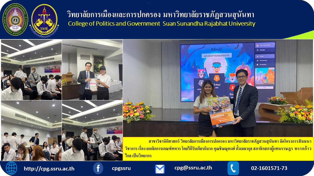 October 16, 2023, 1:00 p.m. - 4:00 p.m., Department of Law College of Politics and Administration Suan Sunandha Rajabhat University Organize an academic seminar project on the topic of abolishing military conscription. We were honored by Mr. Chisanupong Tangmethakul, Member of the House of Representatives, Progressive Party, as a speaker. This activity is part of the measurement/evaluation course LAW 3807, Legal Academic Seminar.