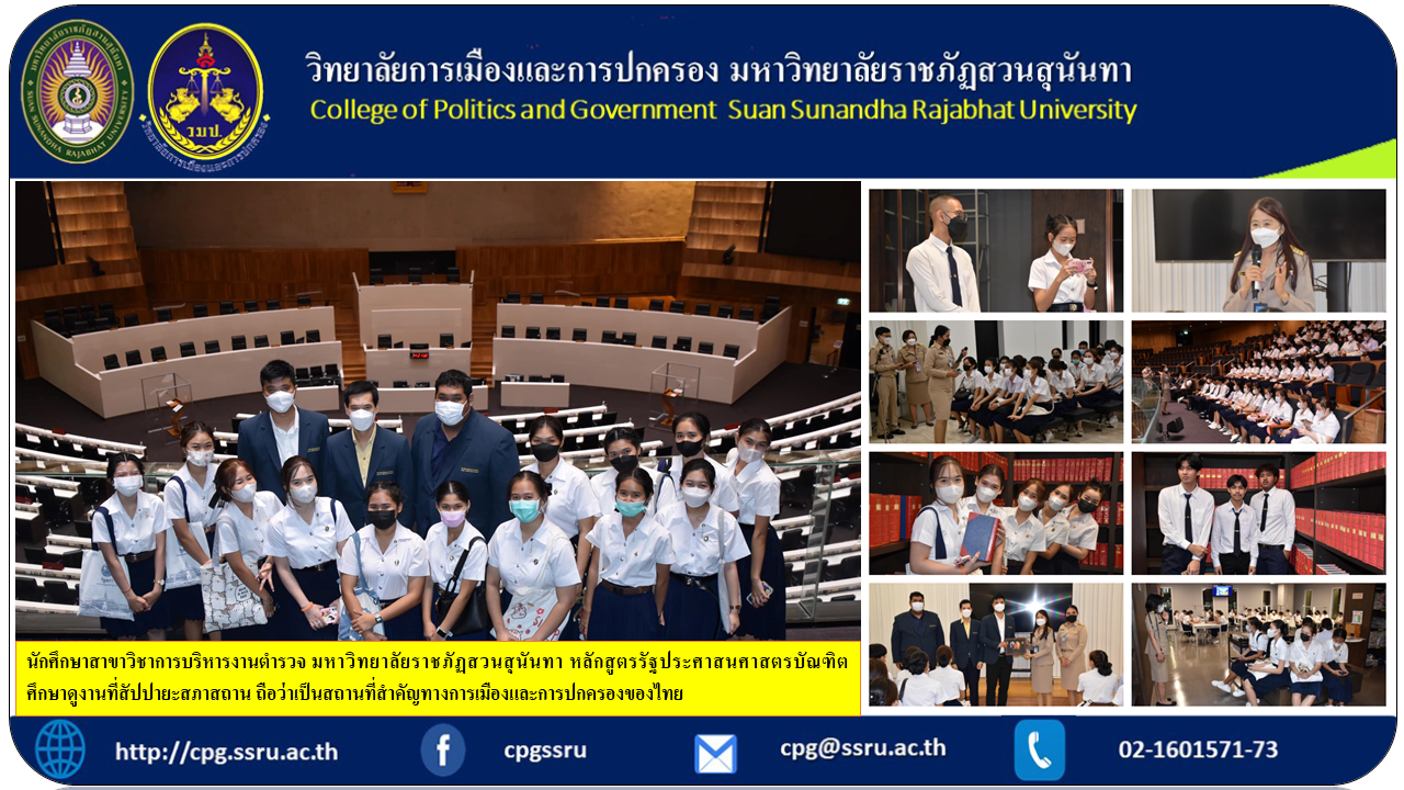 In addition to learning in the classroom We also go out to learn from real places! This time we went for a study visit at Sappaya Sapha Sathan. It is considered an important place in Thai politics and administration. By the head of the branch, Ajarn Wanchak Noichan, Dr. Boonwat Sawangwong and Ajarn Rapeephat Chantaninthorn. Thank you for the lecture information. and beautiful pictures from visit parliament Secretariat of the House of Representatives Interested in enrolling at https://admission.ssru.ac.th/ isqy01 Where will it be next time? Insiders want to go out, outsiders still don't want to go in. Don't forget to follow the page Bachelor of Public Administration course Department of Police Administration Suan Sunandha Rajabhat University.
