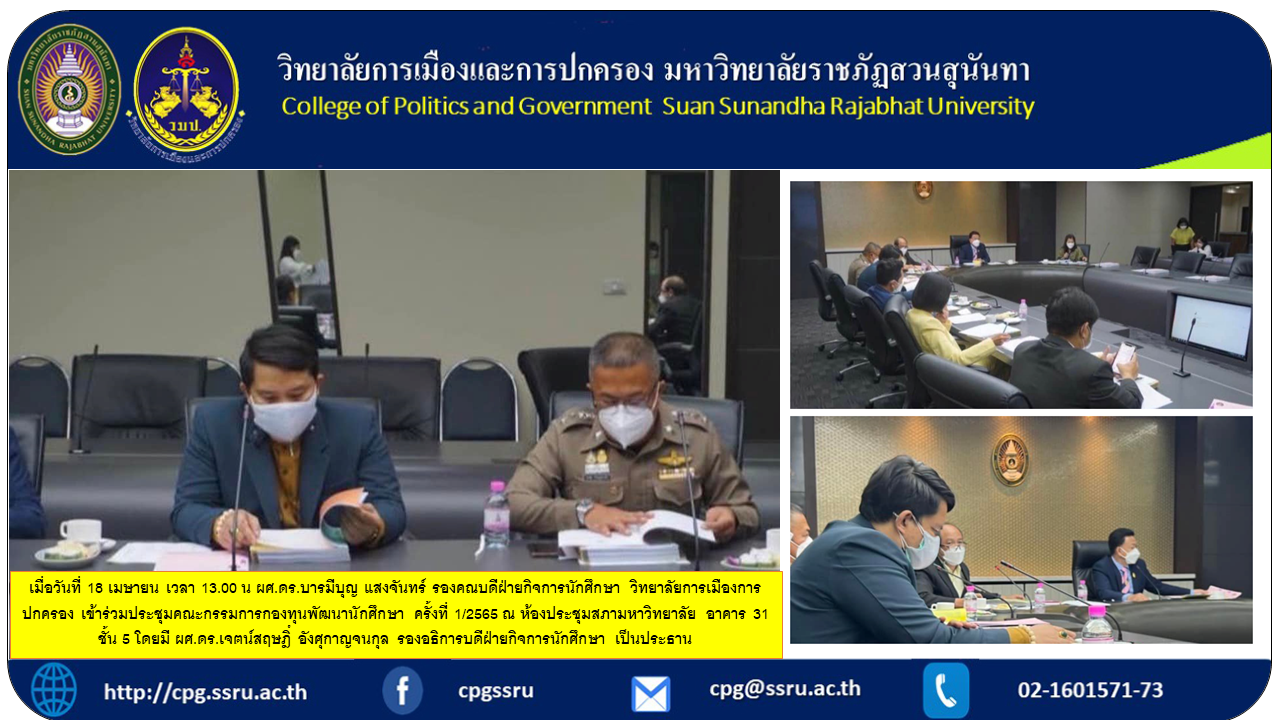 On April 18, at 13.00, Asst. College of Politics and Governance Attended the Student Development Fund Committee Meeting No. 1/2022 at the University Council Meeting Room, Building 31, 5th Floor, with Asst. Prof. Dr. Jetsarit Angsukanchanakul Vice President for Student Affairs as the chairman.