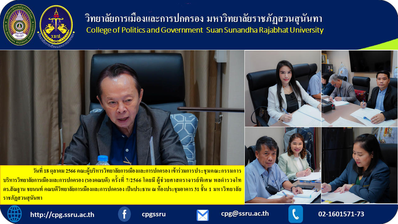 On October 18, 2023, the executive committee of the College of Politics and Government Attended the meeting of the College of Politics and Governance Executive Committee (Deputy Dean) No. 7/2023 with Special Assistant Professor Police Lieutenant General Dr. Santhan Chayanon, Dean of the College of Politics and Governance, presiding at the meeting room of the 31st floor building. 1 Suan Sunandha Rajabhat University.