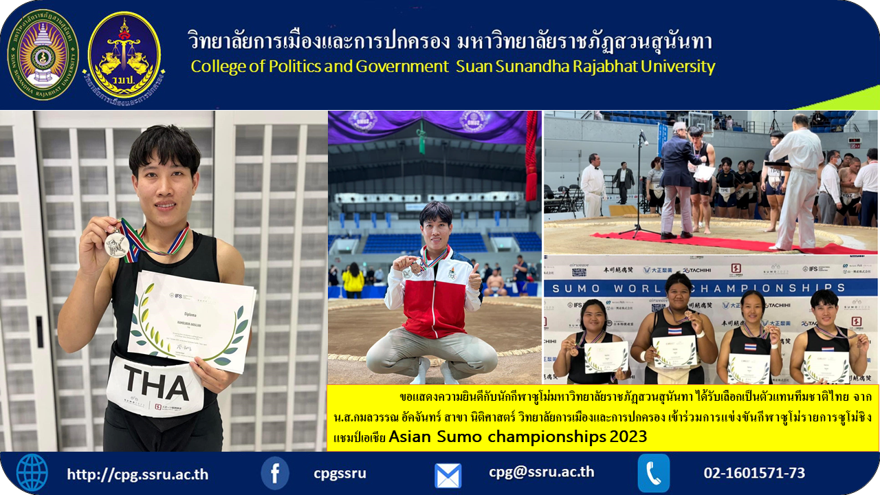 Congratulations to the sumo athletes of Suan Sunandha Rajabhat University. Was selected to represent the Thai national team. From Ms. Kamonwan Akchan, Department of Law, College of Politics and Government Participated in the Asian Sumo Championships2023 at Arena Tachikawa Tachihi, Tokyo Japan on October 7-8, 2023. Won 1 silver medal in the women's weight category not exceeding 65 kg., and 1 bronze medal. Women's team type.