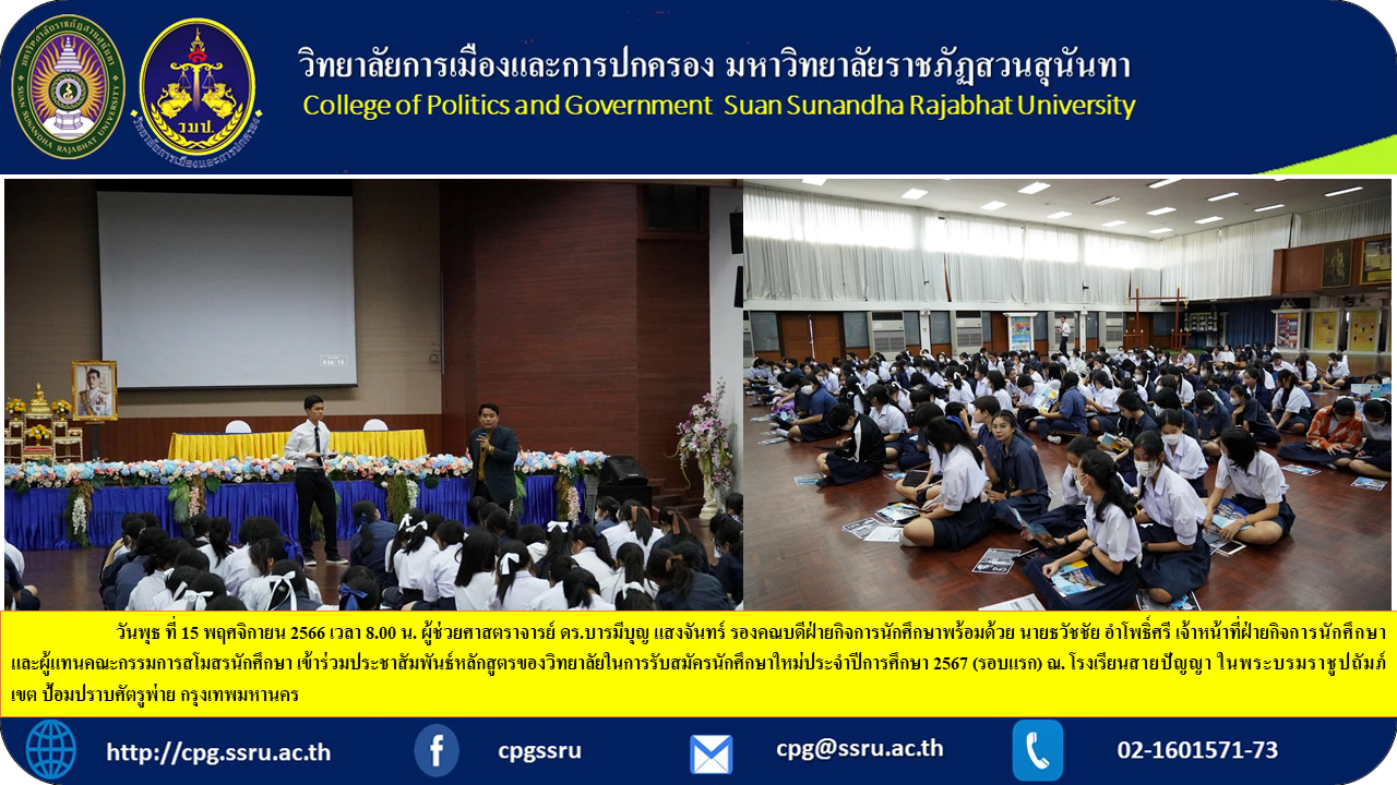 Wednesday, November 15, 2023 at 8:00 a.m. Assistant Professor Dr. Barameebun Saengchan, Deputy Dean for Student Affairs, along with Mr. Thawatchai Amphosri, Student Affairs Officer and Student Club Committee representative. Participated in publicizing the college's curriculum for recruiting new students for the academic year 2024 (first round) at Sai Panya School. Under the Royal Patronage, Pom Prap Sattru Phai District Bangkok.